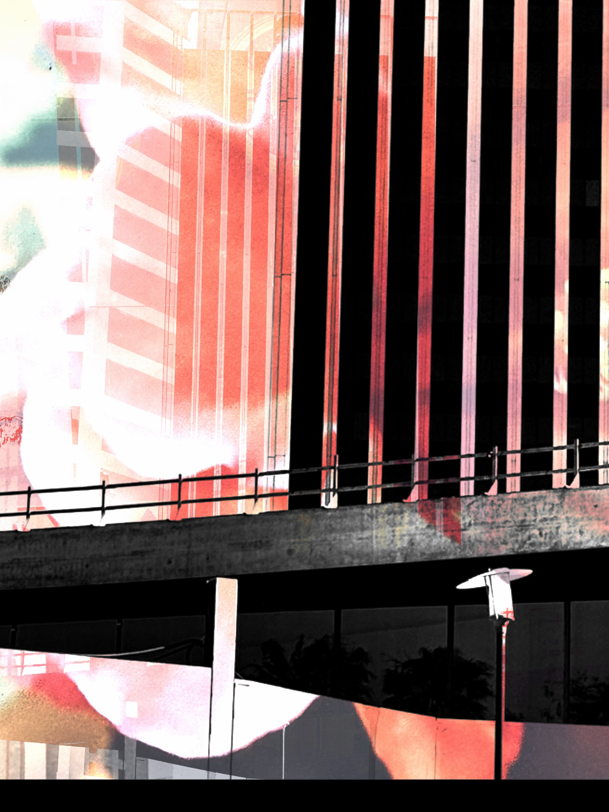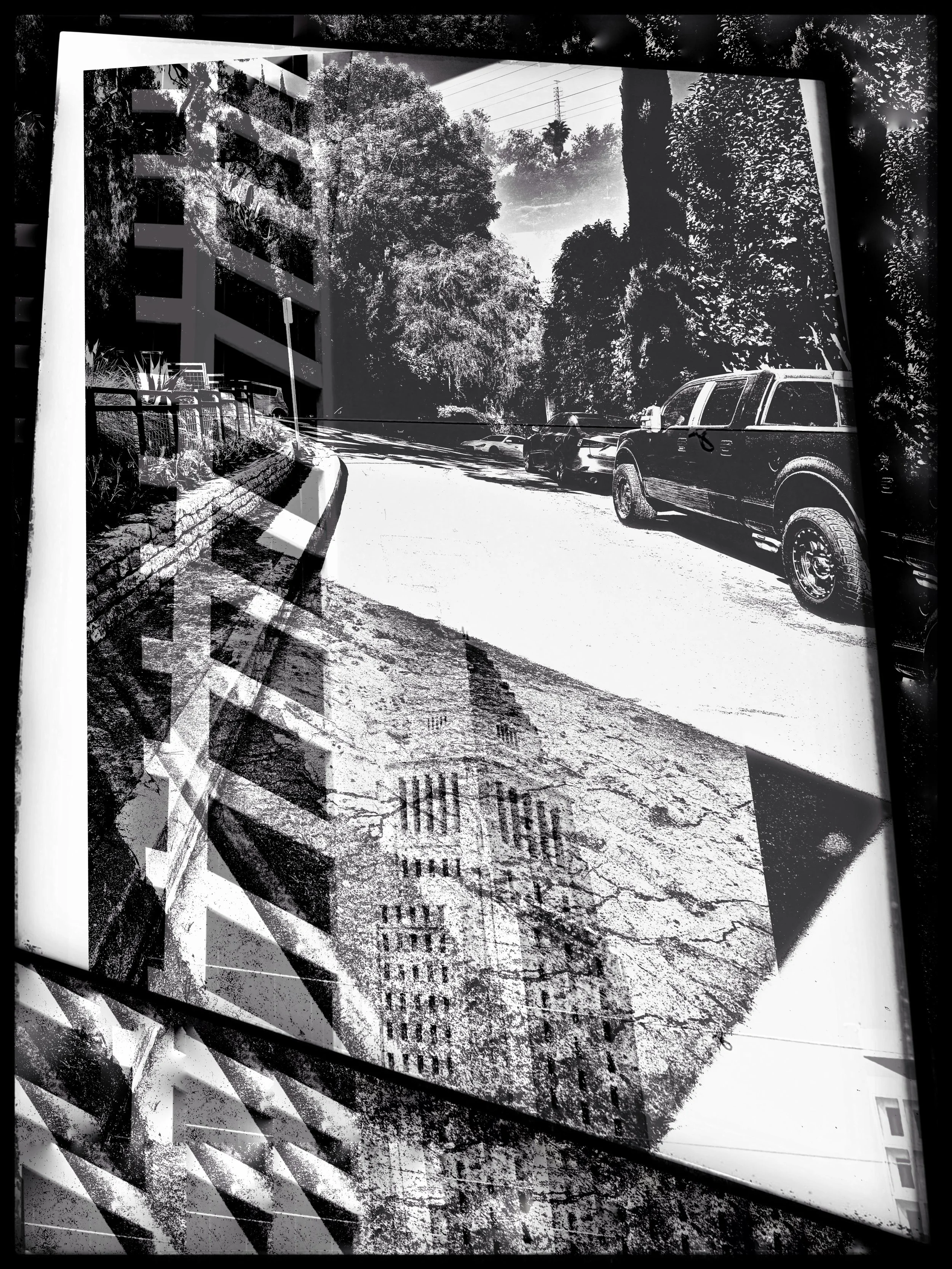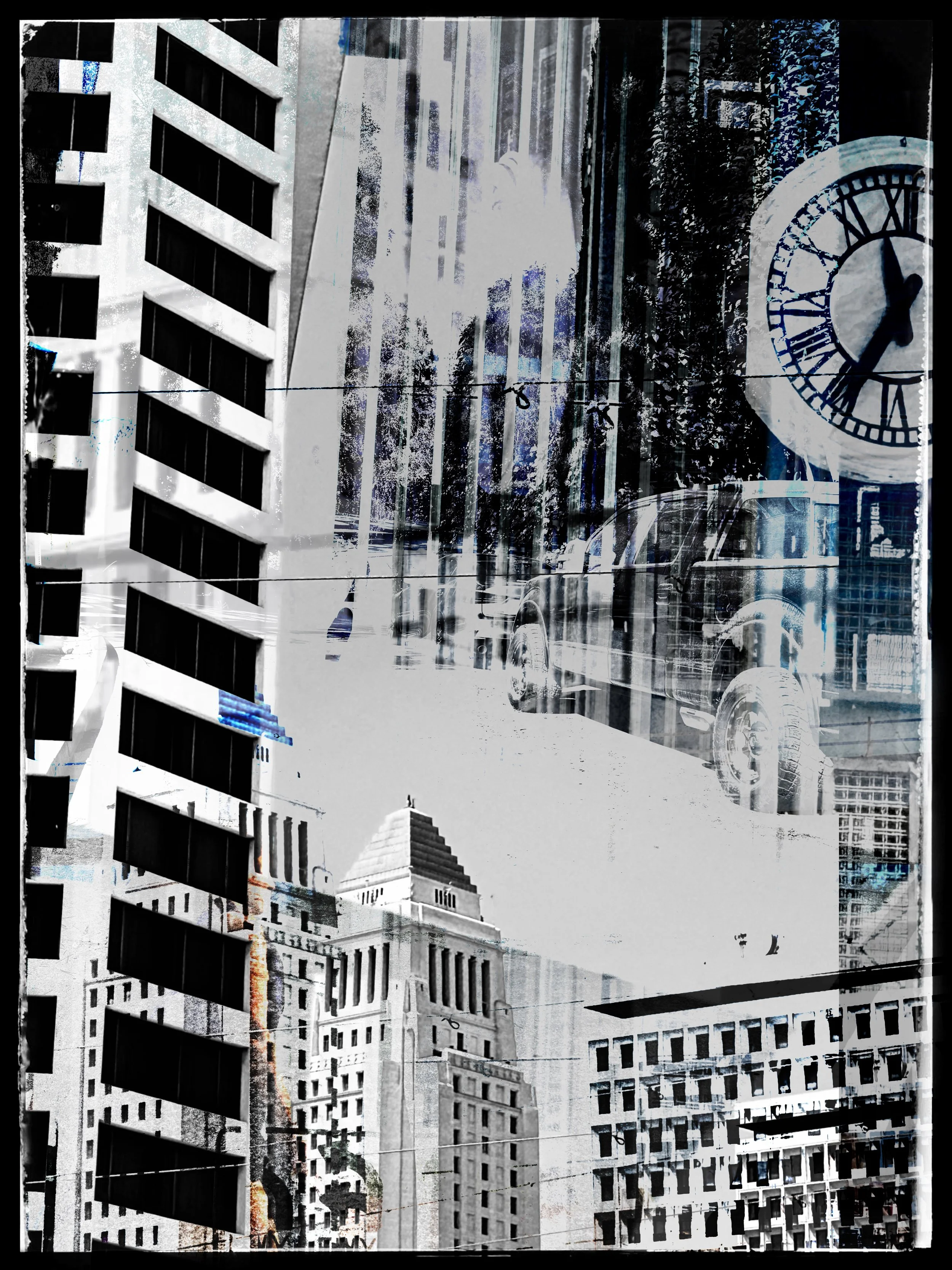This series was shot in Downtown. Los Angeles. In several of the photographs I used the stripes to create a striking contrast that emphasizes the building's height and sleek, angular form. I photographed the structures and in post processing overlaid images with geometric elements, blending architectural details from different angles and perspectives creating a composition that gives life and movement to the architecture. In many of the photographs I used a monochromatic palette with subtle hints of color, to add depth and intrigue to the urban scene.
